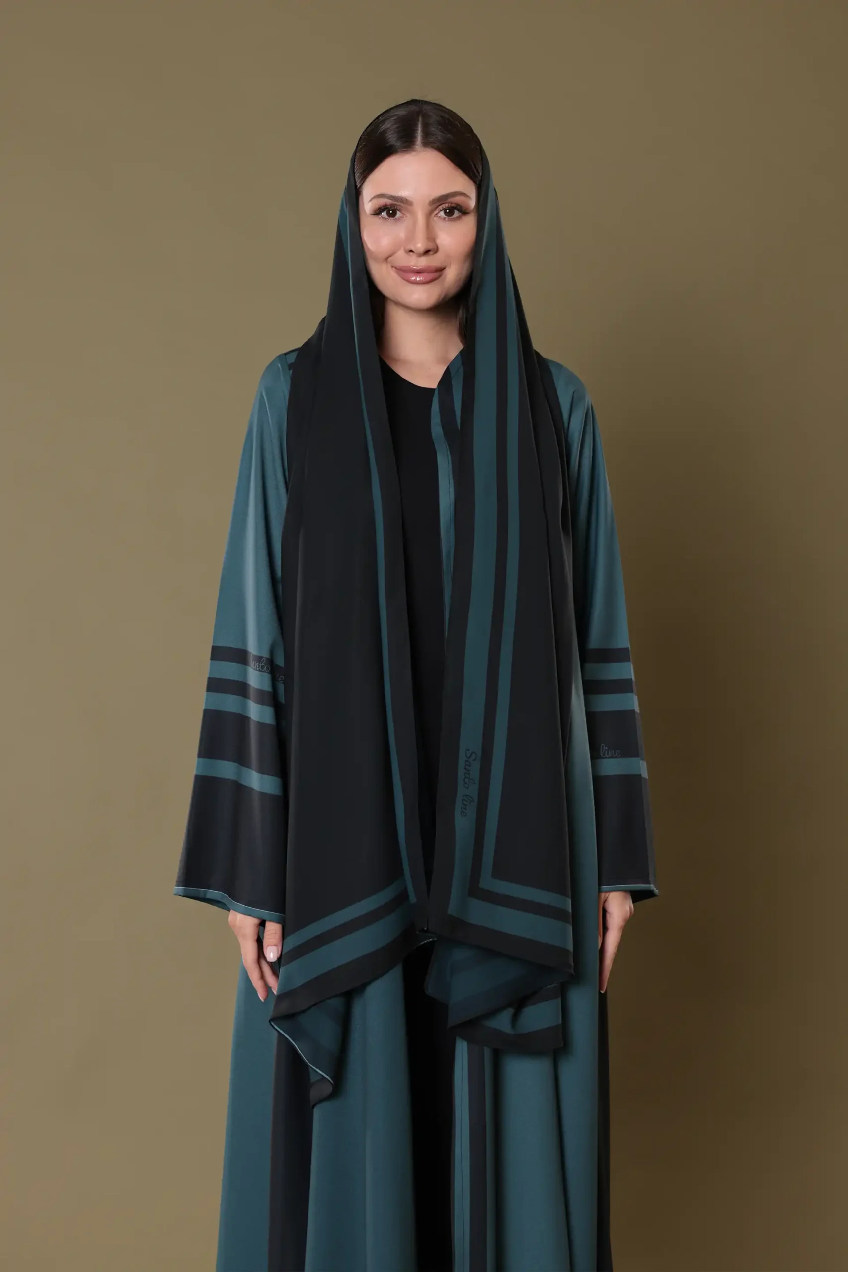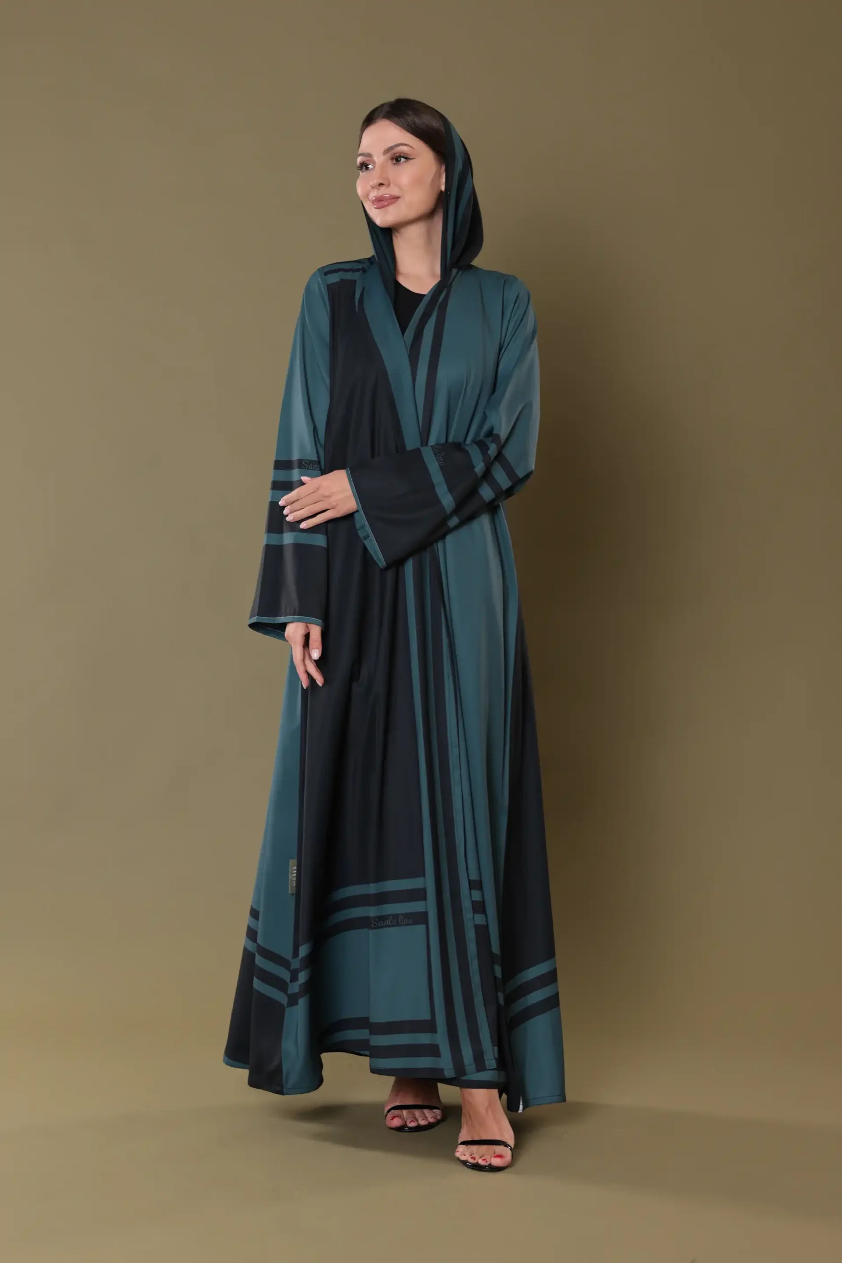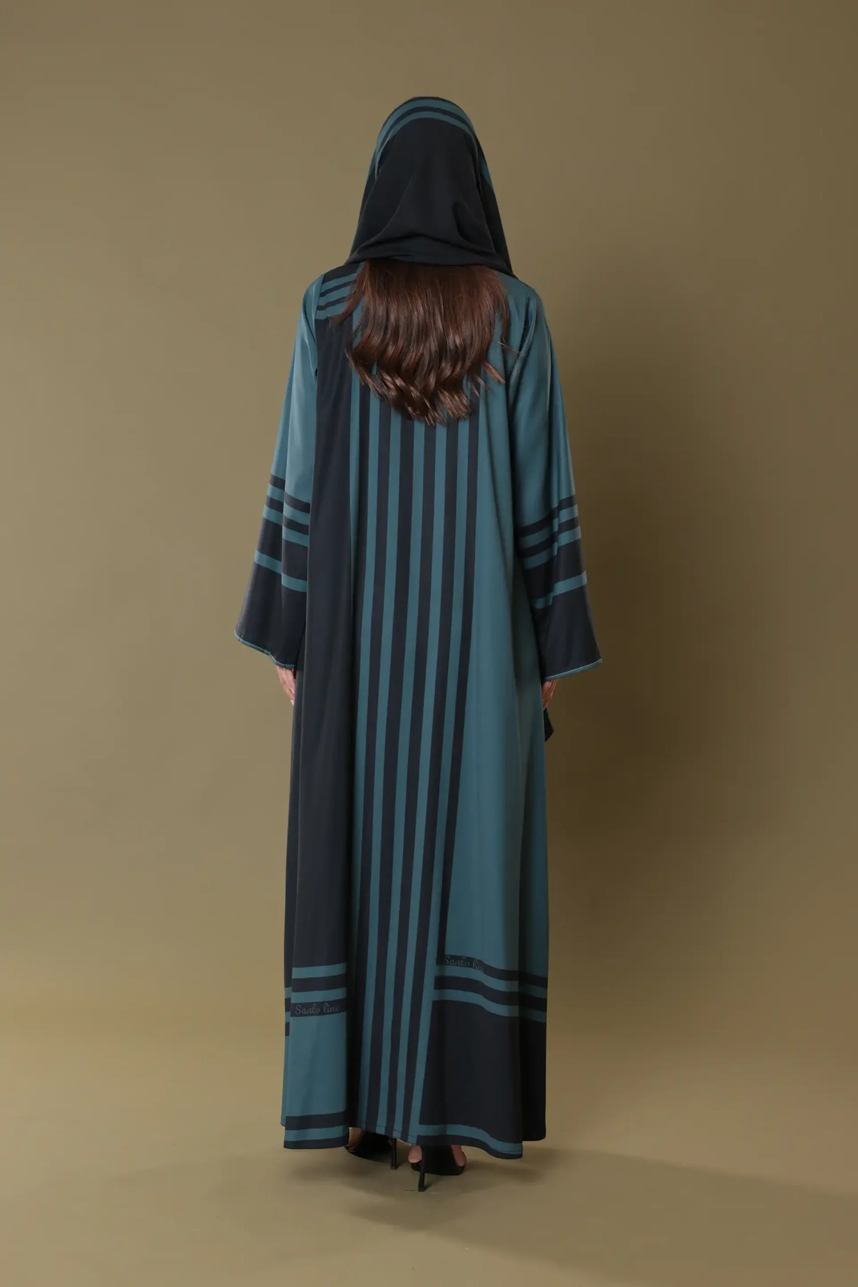 This design draws its inspiration from the interplay between shadows and structure. Influenced by the silent beauty of dusk and the lines cast by architectural silhouettes at sunset, the print embraces minimalism through contrast. The repeating horizontal and vertical bands evoke feelings of stability and grace, while the negative space between them introduces lightness. The abaya captures a balance of movement and stillness, echoing timeless design principles through symmetry, rhythm, and space.