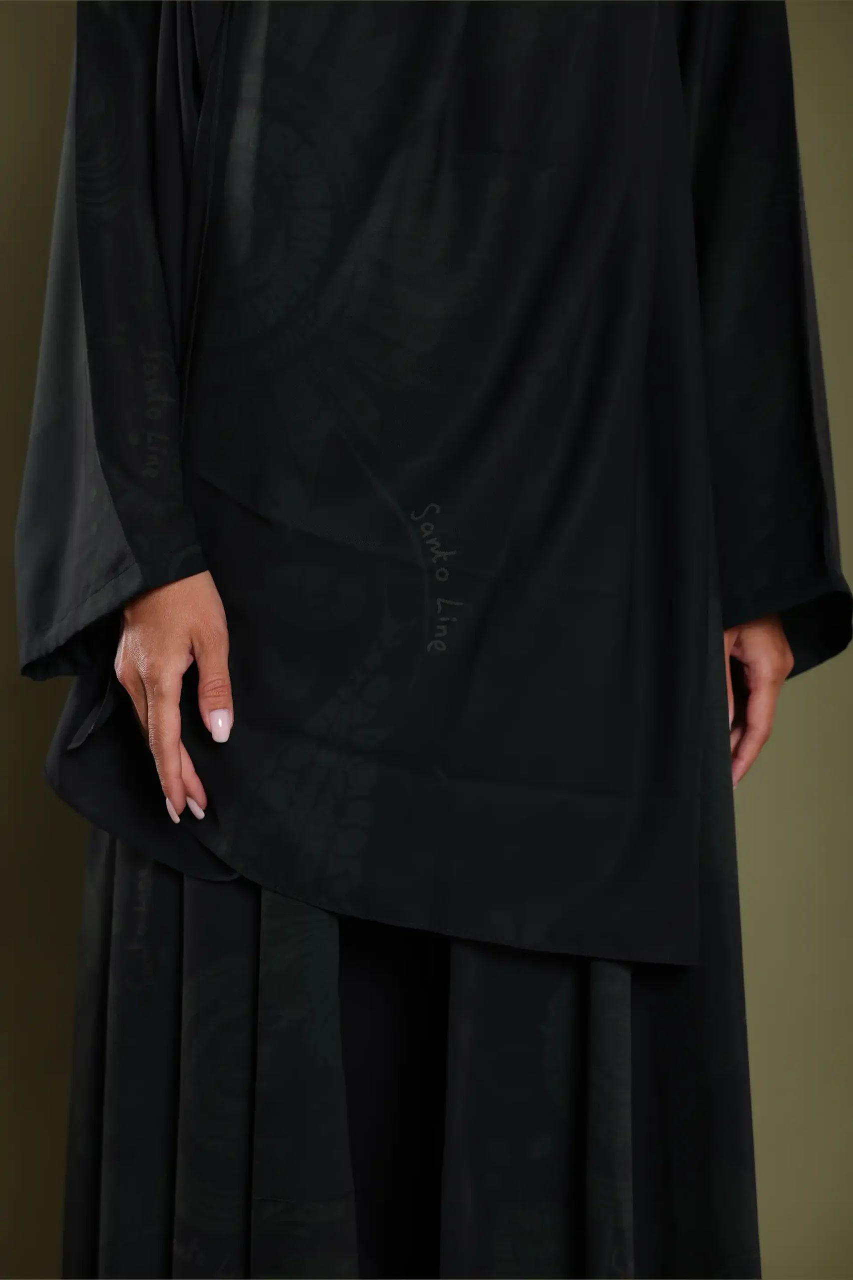 This design draws its inspiration from the interplay between shadows and structure. Influenced by the silent beauty of dusk and the lines cast by architectural silhouettes at sunset, the print embraces minimalism through contrast. The repeating horizontal and vertical bands evoke feelings of stability and grace, while the negative space between them introduces lightness. The abaya captures a balance of movement and stillness, echoing timeless design principles through symmetry, rhythm, and space.