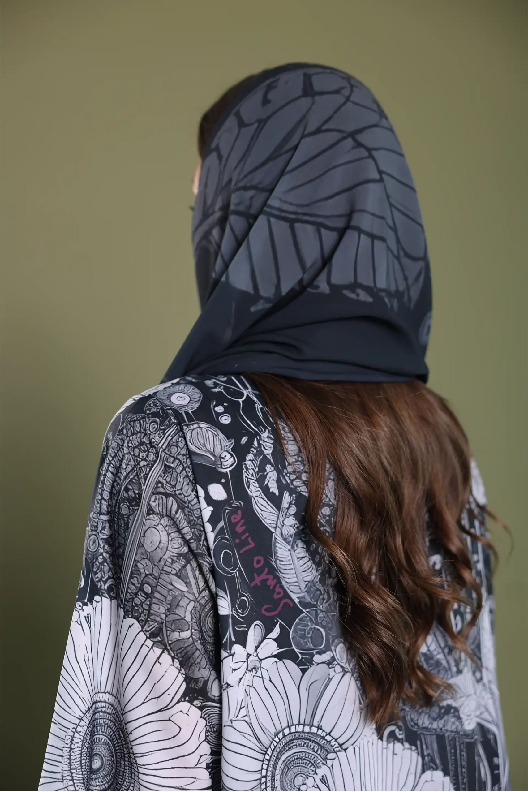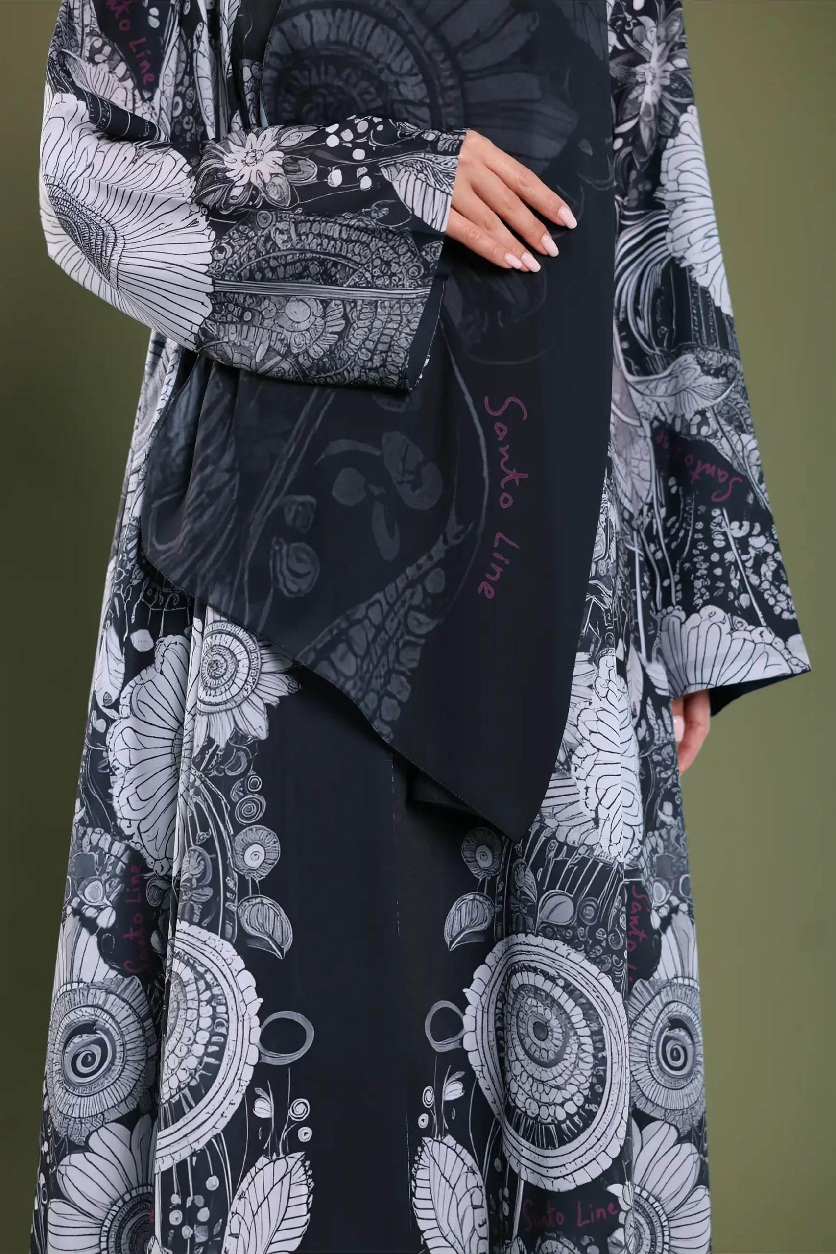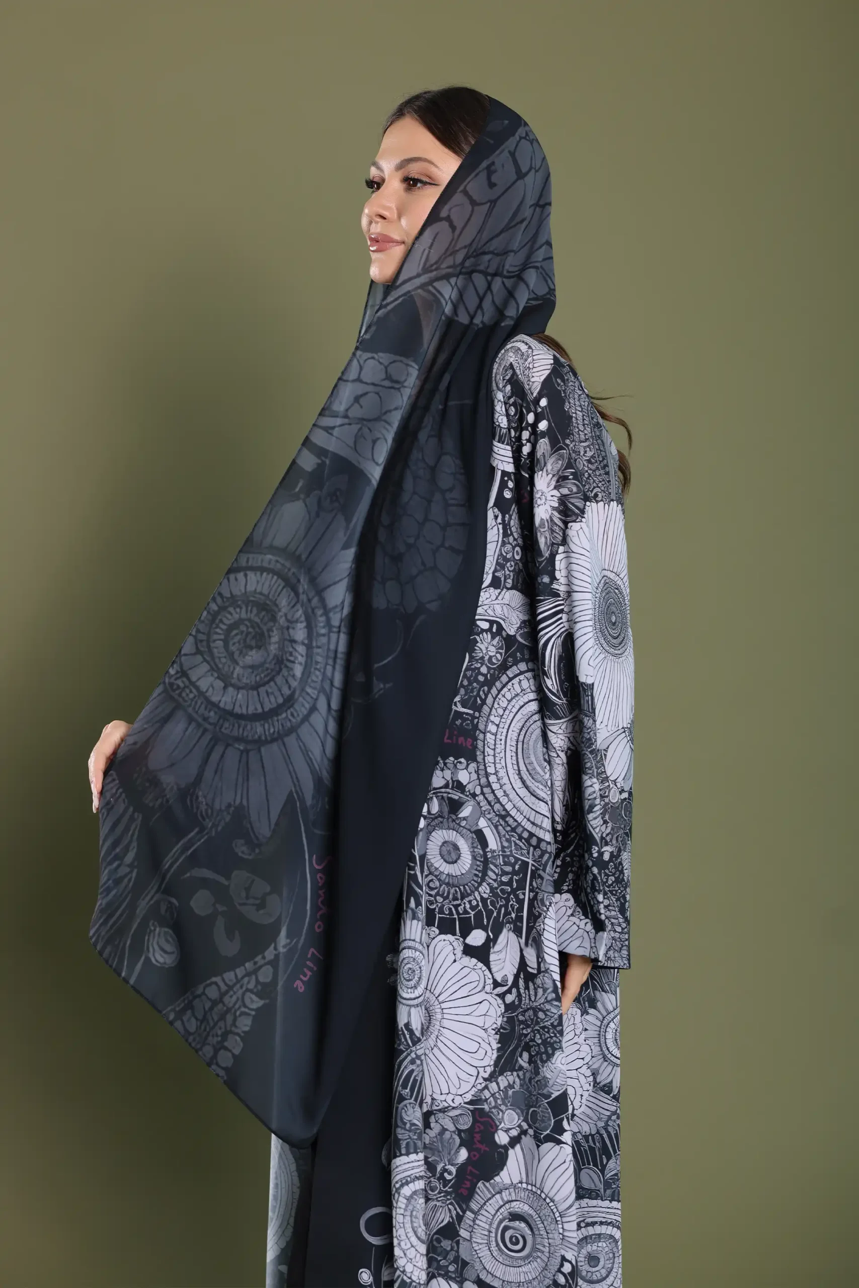 This design draws its inspiration from the interplay between shadows and structure. Influenced by the silent beauty of dusk and the lines cast by architectural silhouettes at sunset, the print embraces minimalism through contrast. The repeating horizontal and vertical bands evoke feelings of stability and grace, while the negative space between them introduces lightness. The abaya captures a balance of movement and stillness, echoing timeless design principles through symmetry, rhythm, and space.