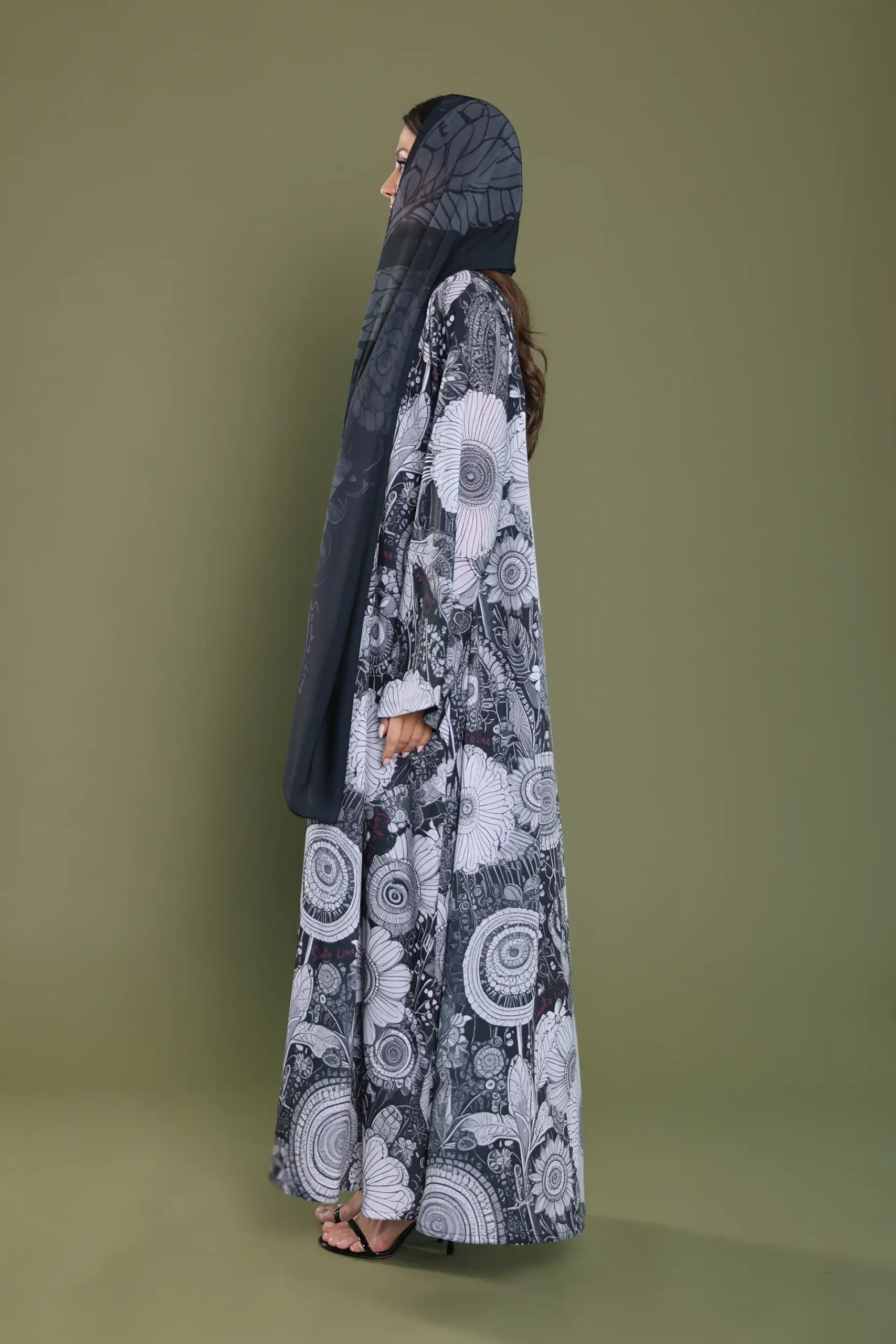 The print also takes cues from the visual rhythm of urban landscapes – grids, windows, and skylines. The structured lines and blocks in the design mimic the repetition and order seen in modern city architecture. This fusion of tradition with contemporary form gives the abaya a cosmopolitan edge while staying rooted in elegance and cultural expression.