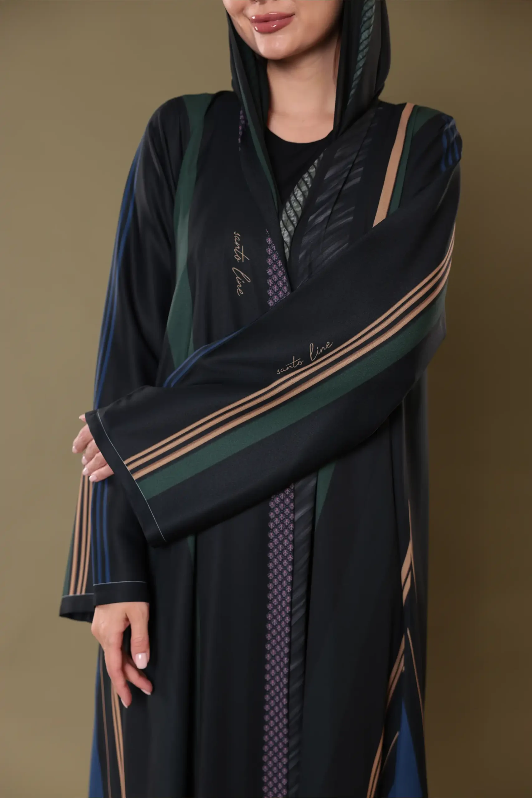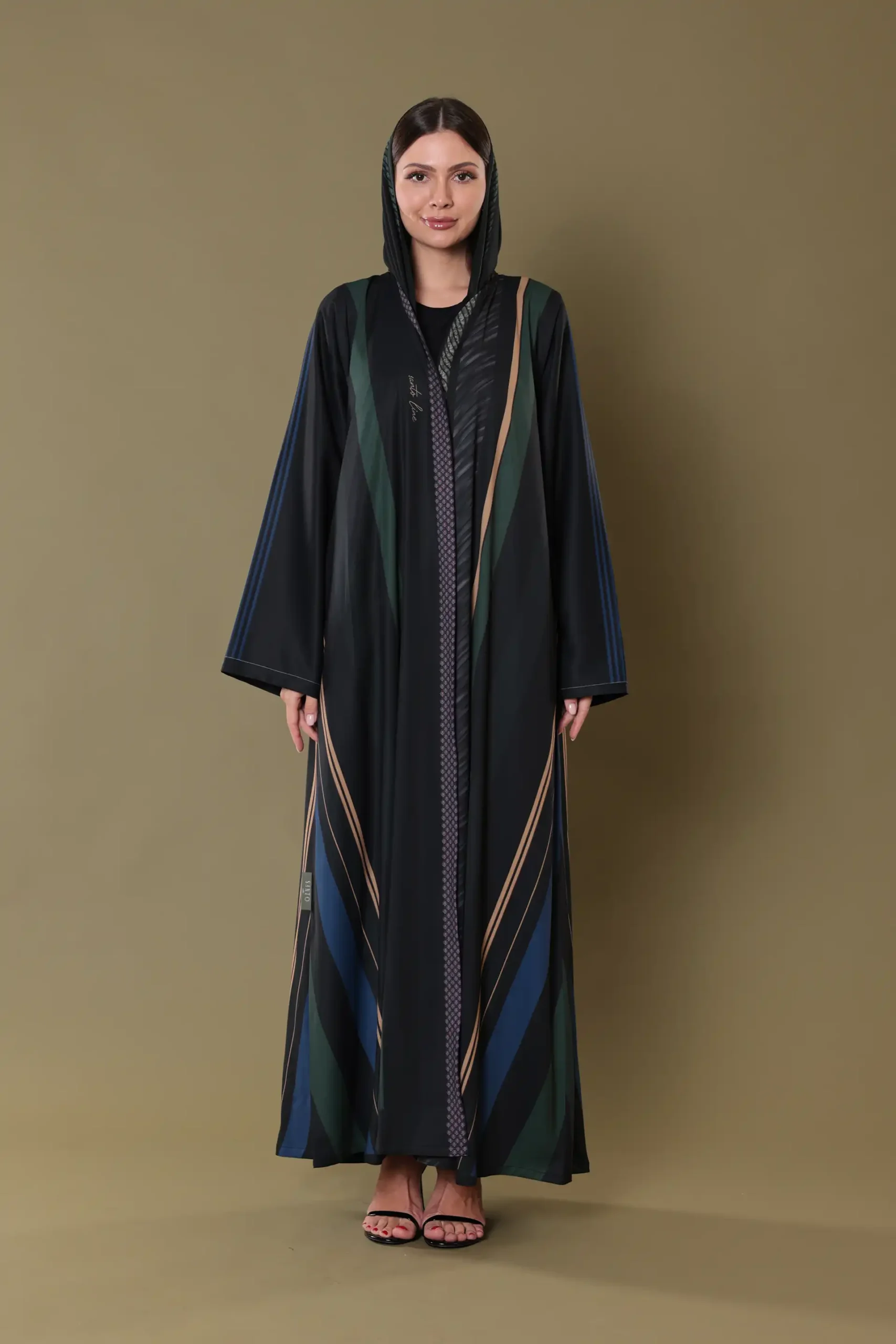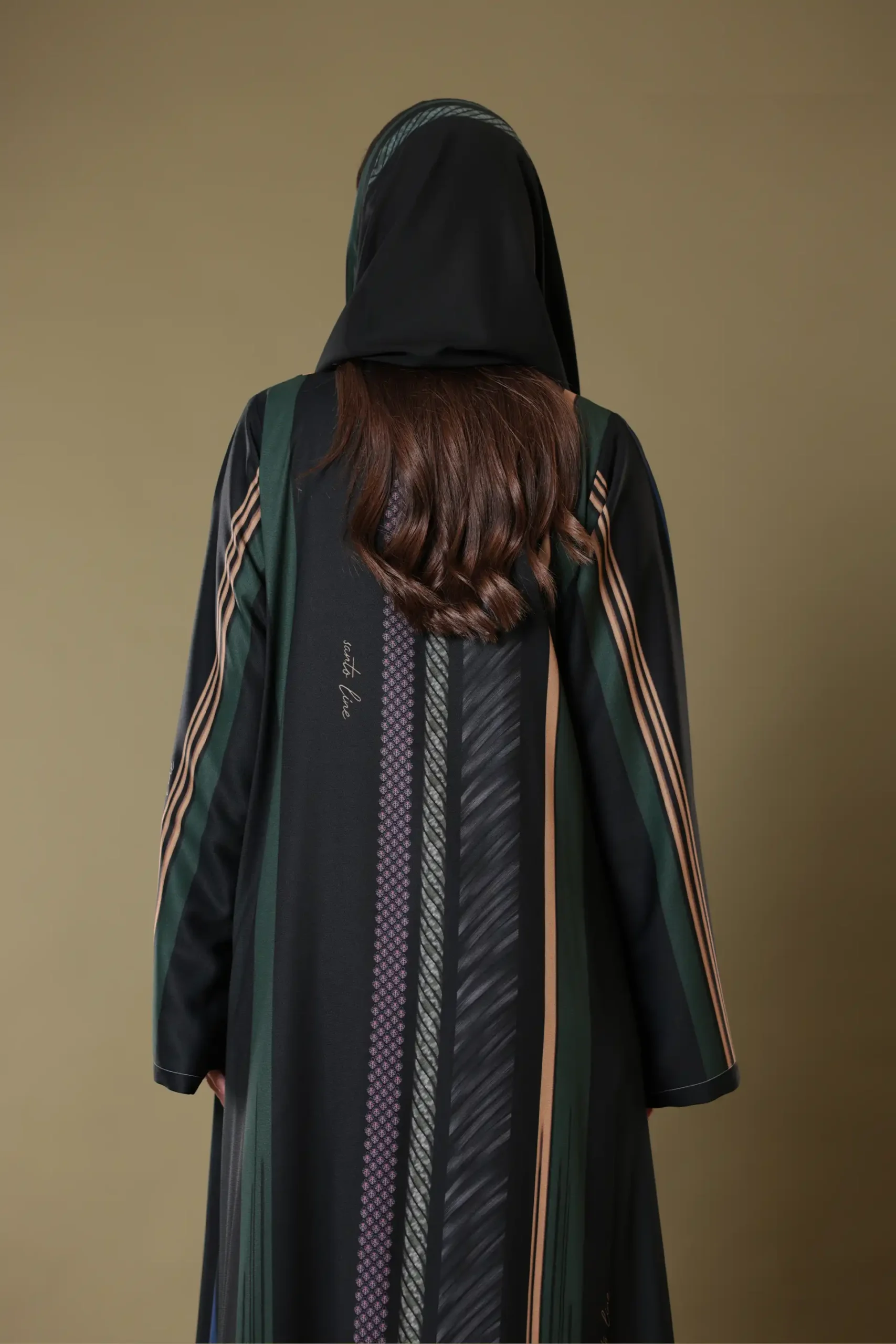 This design draws its inspiration from the interplay between shadows and structure. Influenced by the silent beauty of dusk and the lines cast by architectural silhouettes at sunset, the print embraces minimalism through contrast. The repeating horizontal and vertical bands evoke feelings of stability and grace, while the negative space between them introduces lightness. The abaya captures a balance of movement and stillness, echoing timeless design principles through symmetry, rhythm, and space.