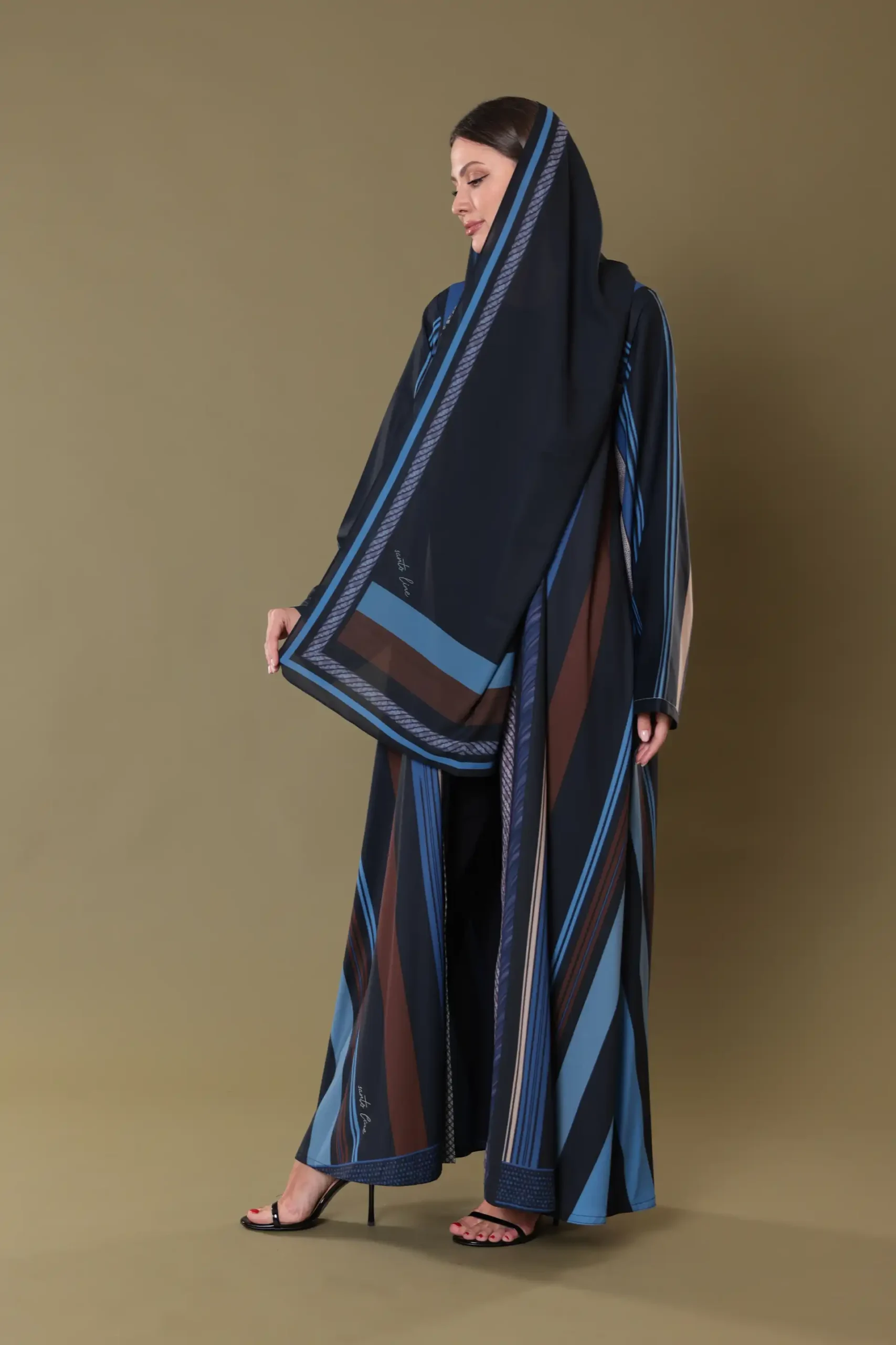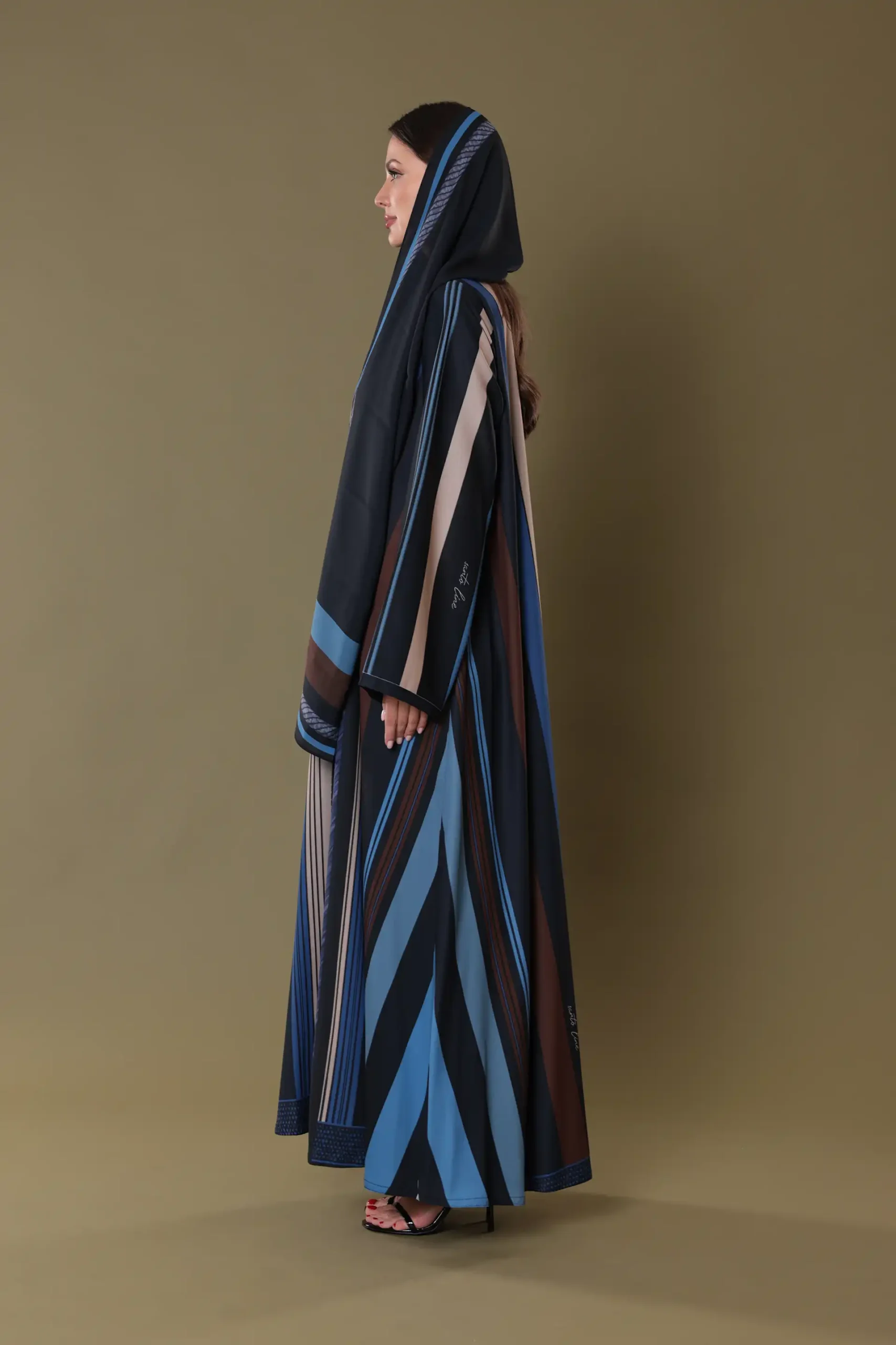 This design draws its inspiration from the interplay between shadows and structure. Influenced by the silent beauty of dusk and the lines cast by architectural silhouettes at sunset, the print embraces minimalism through contrast. The repeating horizontal and vertical bands evoke feelings of stability and grace, while the negative space between them introduces lightness. The abaya captures a balance of movement and stillness, echoing timeless design principles through symmetry, rhythm, and space.