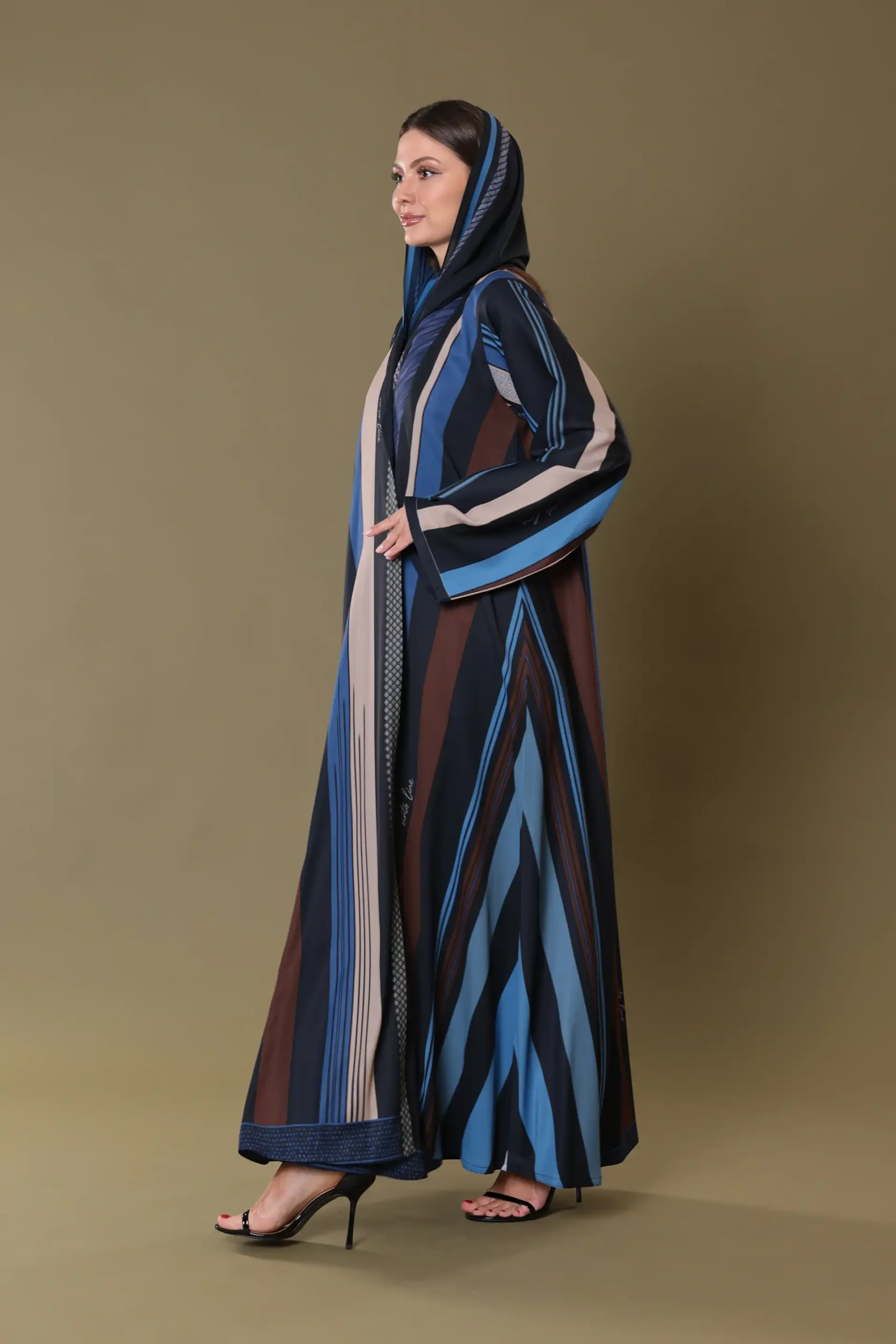 The print also takes cues from the visual rhythm of urban landscapes – grids, windows, and skylines. The structured lines and blocks in the design mimic the repetition and order seen in modern city architecture. This fusion of tradition with contemporary form gives the abaya a cosmopolitan edge while staying rooted in elegance and cultural expression.